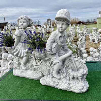 A virágtartós szobornak gyártottuk biciklis lányt. Cikkszáma: K1898. Párban elhelyezve vidám és bájos kerti díszt alkotnak. Ha szereti a különlegességeket, az egyediséget, akkor ezek a kerti dísztárgyak Önnek lettek megalkotva! Jöjjön el dunavarsányi kő lerakattunkban. Óriási akciókkal várjuk a telephelyünkön. Termékeink remekül mutatnak a zöld környezetben, emelik a kert színvonalát. Ajándékként is remek választás a biciklis fiú virágtartós szobor, mivel egy életen át a megajándékozó személyére emlékeztet majd.