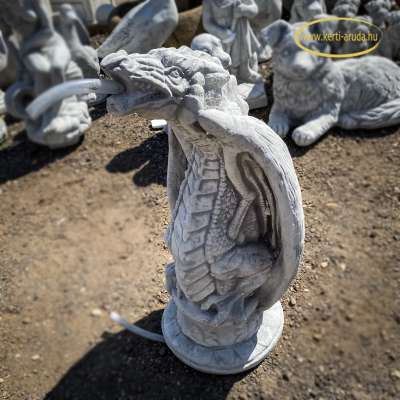 Látványos a méretéből adódóan, egyedi kidolgozással rendelkező szobor. A vízköpő sárkány használható szoborként, kerti tó vagy medence szélére vízköpőként, szökőkút tetejére vízköpőként. Kültéri dekorációs termékeink minőségi kő zúzalékból készülnek, az időjárás viszontagságainak teljes mértékben ellenállnak és fagyállók.